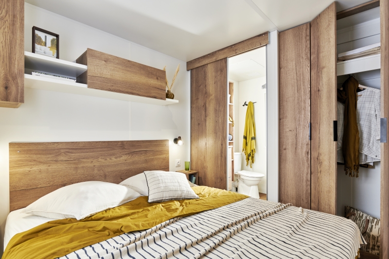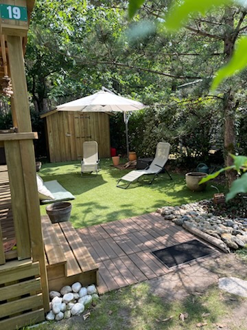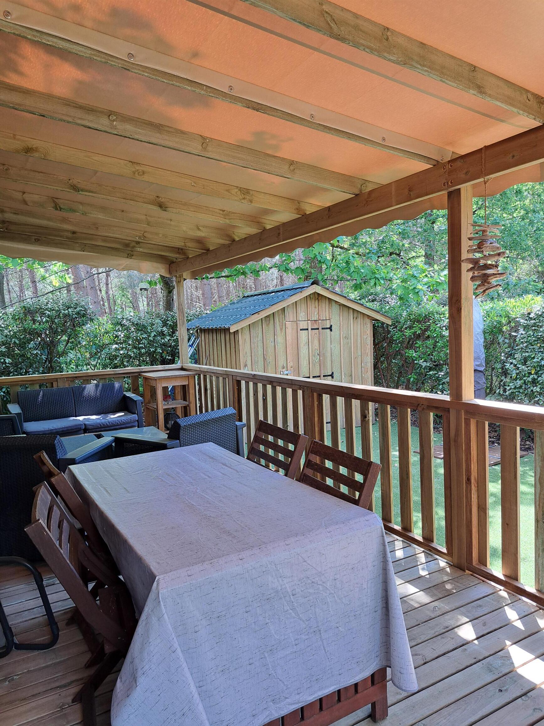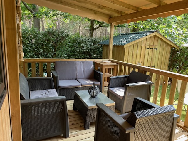 Sur un bel emplacement de 200m² orienté plein ouest et donnant sur la forêt, vous profiterez de la quiétude du fond du camping. Sa terrasse couverte d’une superficie de 20 m² est équipée d’une table pour vos repas et d’un salon-canapé pour vos apéritifs. Les animaux sont interdits dans celui-ci. En haute saison les arrivées se font le dimanche
